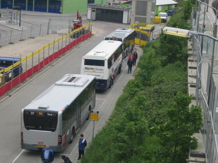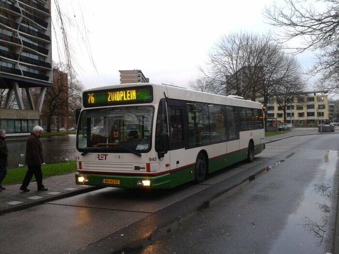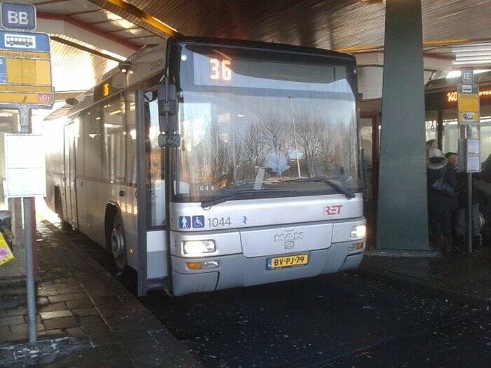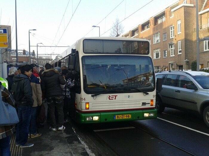 In het weekend van 18 en 19 mei 2012 reden er tussen Rotterdam en Gouda geen treinen wegens werkzaamheden. De NS zette bussen in, welke meestal grote vertraging hadden. We zien hier één van de door NS ingezette bussen tussen twee RET-bussen op lijnen 44 en 33.