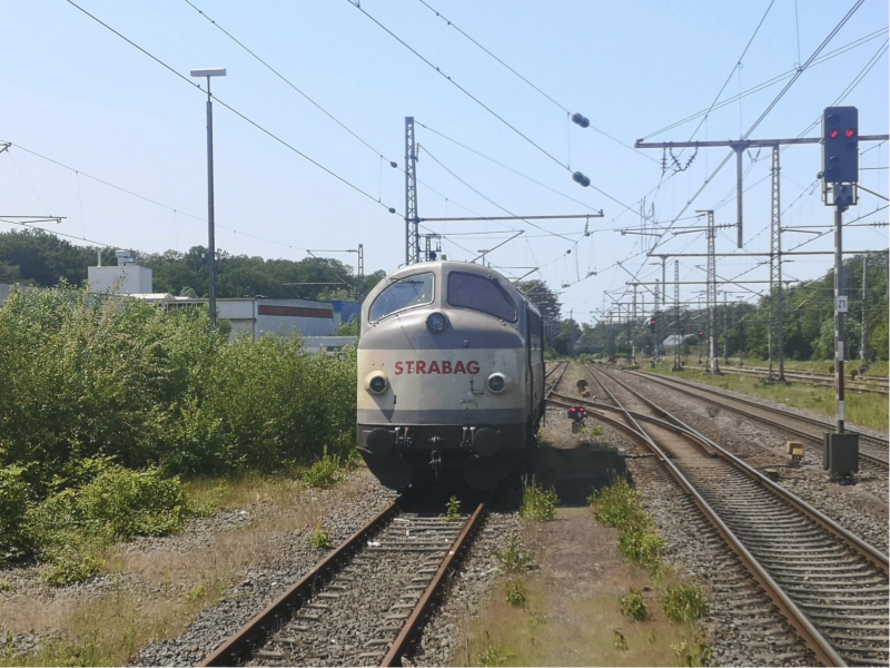 Loc 227 007 van de Zwitserse spooraannemer Strabag in Bad Bentheim, 4 juni 2023. Dit is de voormalige Deense 1147 van de serie DSB MY (II). Deze locs van Amerikaanse makelij zijn gebaseerd op de EMD F-unit uit 1939. De Deense versie verscheen vanaf 1956 op de rails en is rond de eeuwwisseling afgestoten door de nationale spoorwegen. Een deel is sindsdien gesloopt, maar een vrij grote verzameling is nog inzetbaar bij andere maatschappijen.