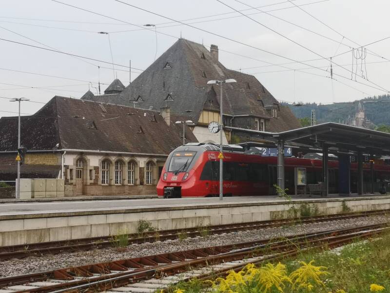 De 442 208 van de Moseltalbahn maakt op 28 augustus 2023 een stop in Cochem. Op de achtergrond is het bekende kasteel van Cochem zichtbaar.