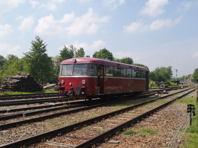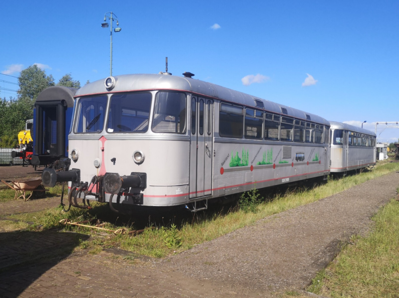 Twee Schienenbussen in Goes, 27 mei 2022. Het gaat hier om motorrijtuig VT 996 783 en stuurstandrijtuig VS 996 770, die na hun loopbaan bij Deutsche Bahn via de Prignitzer Eisenbahn bij de Stoomtrein Goes-Borsele (SGB) terecht zijn gekomen. Sinds 2010 worden ze hier ingezet om ook de stations te kunnen bedienen waar de stoomtrein niet kan stoppen. Daarnaast zijn ze gebruikt als voorbeeld voor de replica's van de voormalige NS omC-rijtuigen die de SGB zelf gebouwd heeft.