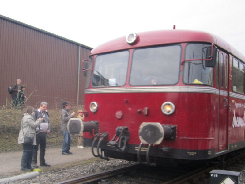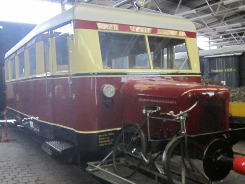 Een railbus op het terrein van het spoorwegmuseum te Bochum op 21 april 2013.  Dit is de zogenaamde Schi-Stra-Bus, een experiment uit de jaren vijftig. Het idee was goed: waar de rails ophield, kon de bus over de weg verder rijden. Als de bus over de rails moest rijden, werd de vooras vastgemaakt op een draaistel en rustten de achterwielen op de rails om de bus aan te drijven. Het ombouwen van de bus was echter een tijdrovend en lastig werkje, de achterbanden sleten snel en bij nat weer hadden ze te weinig grip op de rails. De laatste van de vijftien Schi-Stra-Bussen ging in 1967 uit dienst.
