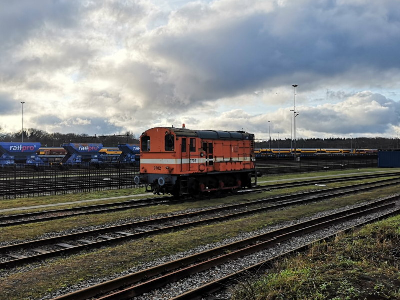Dezelfde 9702 op 8 januari 2021 bij de wagenwerkplaats in Amersfoort. Na het faillissement van Locon in 2017 is de loc eigendom geworden van Jacko Fijn Techniek, die haar vooral verhuurt aan Rail Force One en Eurailscout.