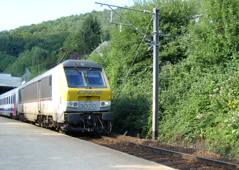 Op 11 augustus 2007 maakt CFL-loc 3020 met een stam I11-rijtuigen van de NMBS een stop op het Belgische station Coo, onderweg van Luik naar Luxemburg.