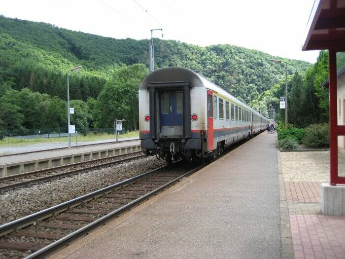 De reden dat er met Belgische rijtuigen wordt gereden is omdat dit de intercitydienst van Luxemburg naar Luik en Liers is, dezelfde die we op de foto uit 2007 in Coo zagen. We zien hier zo'n I11-stam op 5 augustus 2008 bij doorkomst door Clervaux.