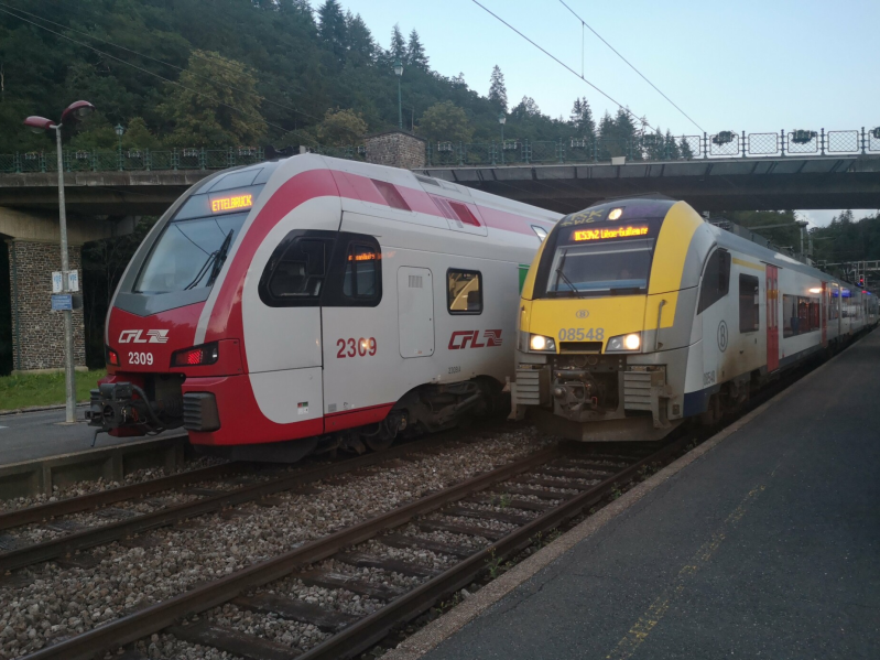 Later die dag staat de 2309 op station Clervaux te wachten op vertrek naar Ettelbruck, terwijl de 08548 van de NMBS een stop maakt onderweg naar Luik.