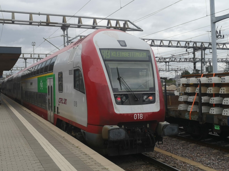 Op één van de kopsporen aan de zuidzijde van het station komt de trein vanuit Kleinbettingen binnen, bestaande uit loc 3008 met Dosto-stam 018.