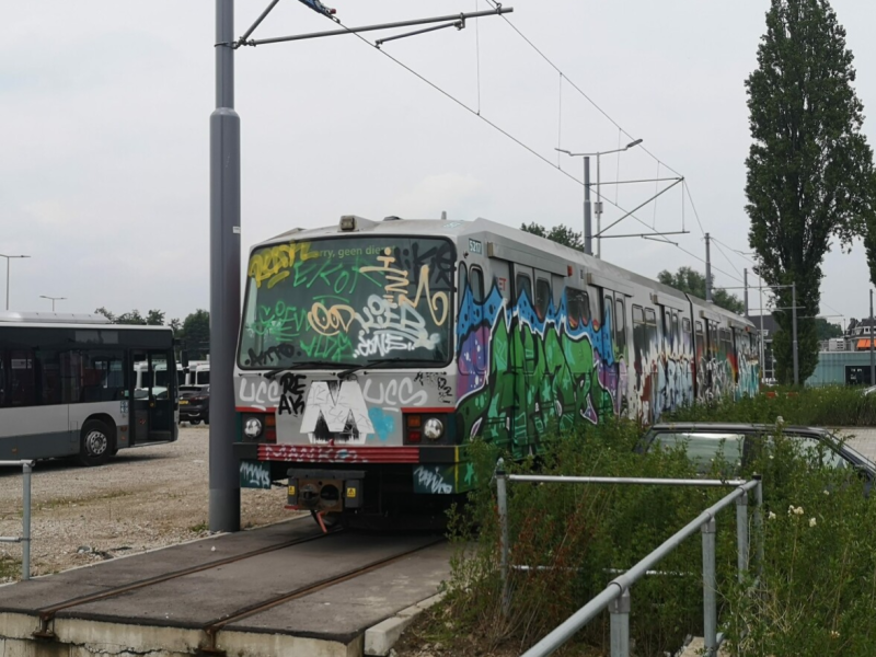 Vanwege zijn werkzaamheden in de brandbeveiliging kwam mijn vader af en toe achter de schermen bij de RET. Zo ook op 3 mei 2012, toen hij bij de remise 's Gravenweg de terzijde gestelde en bijna volledig bekladde 5215 op de foto kon zetten. Opvallend is de eindbestemming De Akkers, aangezien er geen lijnletter bij staat en er voor de ABCDE-tijd de benaming Spijkenisse werd gebruikt.