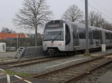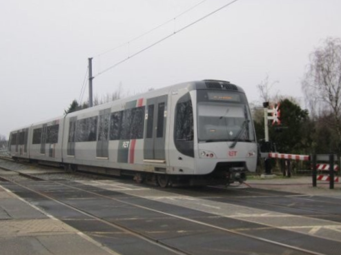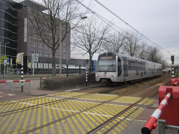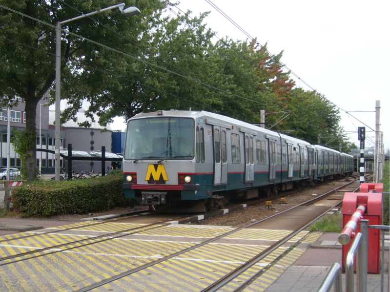 Drie SG2/1-stellen op lijn A naar Binnenhof maken een stop op station Alexander, 15 mei 2010. In tegenstelling tot de MG2/1 is de SG2/1 wettelijk een tram, waardoor deze stellen zijn uitgevoerd met richtingaanwijzers en een extra ruitje in de raamstijl voor meer overzicht.