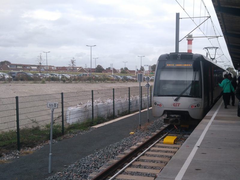 Op 30 september 2019 is na meer dan twee jaar vertraging de Hoekse Lijn heropend als onderdeel van de Rotterdamse metro. Lijn A rijdt sindsdien door van Schiedam Centrum naar Vlaardingen West, lijn B rijdt met de helft van de diensten naar Steendijkpolder in Maassluis en met de andere helft naar Hoek van Holland Haven. Twee dagen voor de opening, op 28 september, kon iedereen die wilde een gratis ritje maken op de Hoekse Lijn. De foto toont HSG3-metrostel 5715 op station Maassluis Centrum, klaar voor vertrek naar Schiedam Nieuwland, het eindpunt van deze tijdelijke pendeldienst.