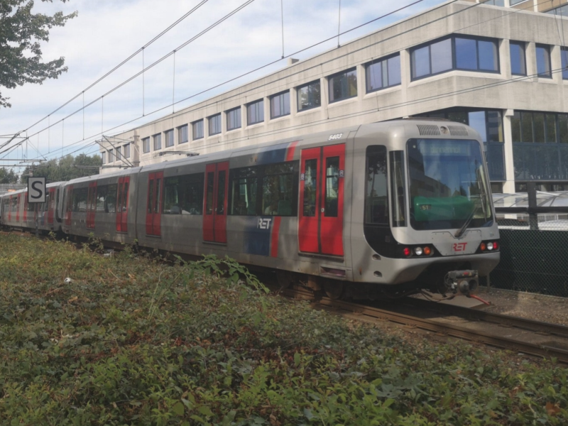 Drie stellen SG2/1 (Type S), met achteraan de 5403, rijden op 6 september 2022 weg van station Alexander als lijn A naar Binnenhof. Tussen 2014 en 2016 is de kleurstelling die we hierboven zagen verruild voor de R-net huisstijl, waarbij de rode deuren het meest in het oog springen.