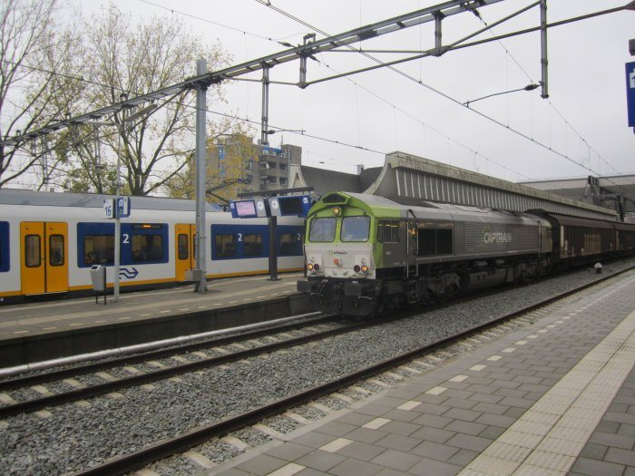 Een Class 66 van Captrain bij de doorkomst door Rotterdam Centraal over spoor 15 op 10 november 2012.