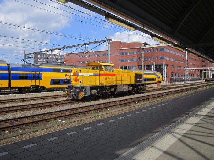 Loc 303001 van Strukton, bijgenaamd Carin, heeft op 23 juni 2012 net haar lange rij wagons achtergelaten naast het station van Amersfoort en rijdt weer terug naar haar standplaats een klein stukje verderop.