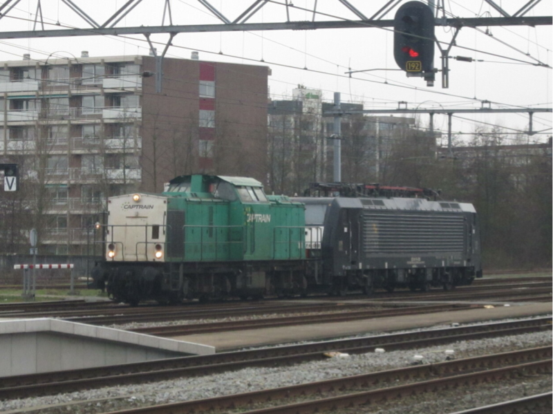 V100 no. 101 van Captrain rijdt met een Baureihe 189 van MRCE door station Gouda op 9 februari 2013.