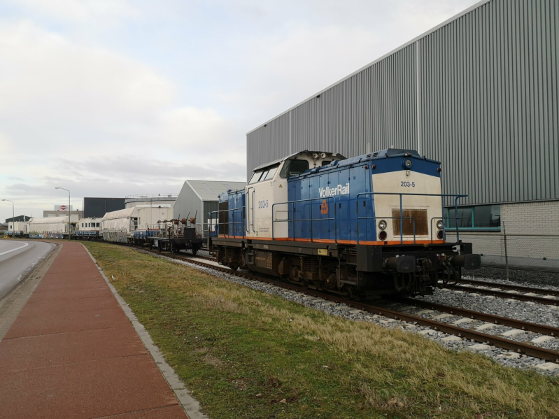 Loc 203-5, één van de vier V100'en van VolkerRail (sinds de 203-3 in 2016 aan RRF is overgedragen), stond op 28 december 2020 met een werktrein opgesteld naast de werkplaats van VolkerRail in het Zeehavengebied van Dordrecht.