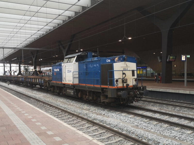 Op 5 februari 2023 staat de 203-4 van VolkerRail met een ballasttrein op spoor 5 van Rotterdam Centraal.