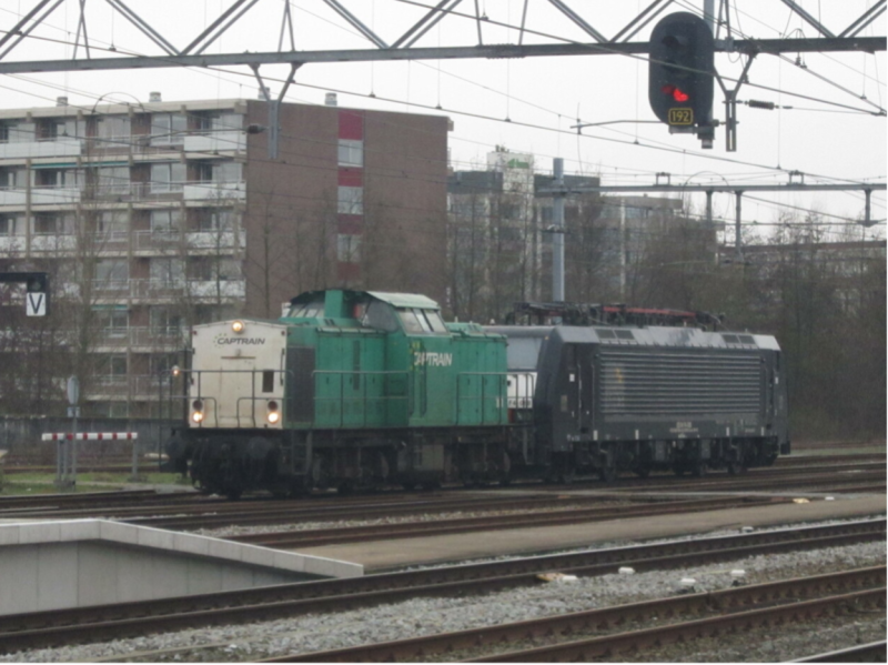 V100 no. 101 van Captrain trekt een 189 van MRCE door station Gouda, 9 februari 2013.