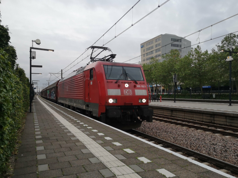 De 189 823 van Deutsche Bahn rijdt op 21 juni 2021 door station Rotterdam Zuid met de 'Electroluxtrein', die vier keer per week rijdt tussen de Kijfhoek en het magazijn van deze witgoedfabrikant te Alphen aan den Rijn.