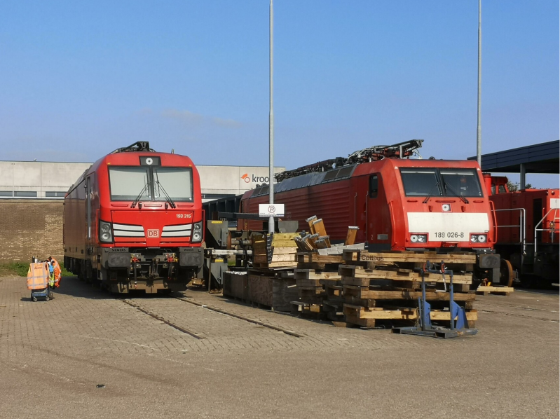 DB Cargo-locs 193 315 en 189 026 bij de werkplaats van Shunter Waalhaven op 23 juli 2021.