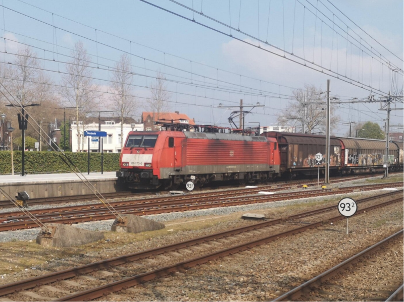 Loc 189 073 van Rail Force One komt op 21 april 2023 met een goederentrein door station Dordrecht.