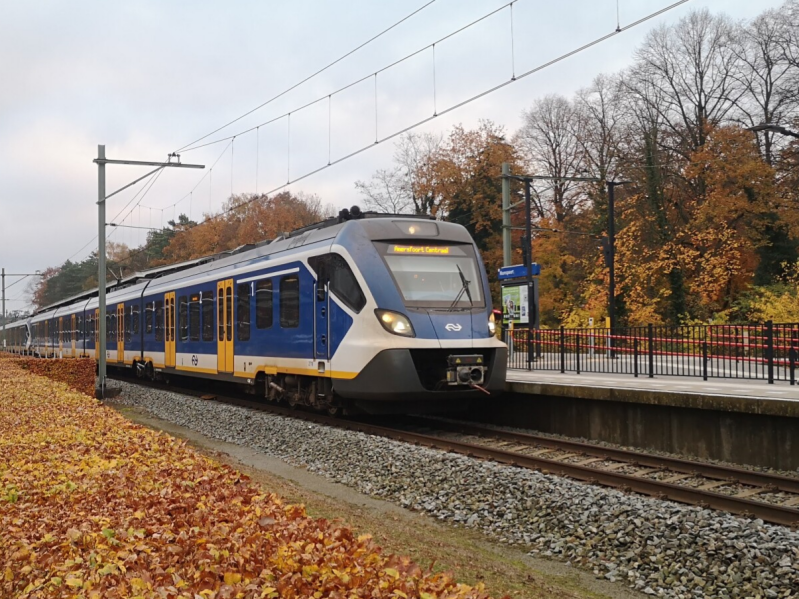 De 2718 maakt samen met een soortgenoot op 13 november 2021 een stop op het door herfstkleuren omgeven station Nunspeet, onderweg van Zwolle naar Amersfoort Centraal.