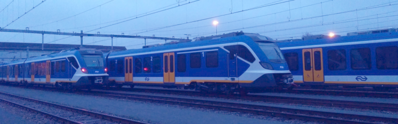 Meerdere SNG's achter de wagenwerkplaats te Amersfoort in de avondschemer van 6 december 2018. Met ingang van de dienstregeling van 2019 later die maand zou de SNG voor het eerst ingezet worden.
