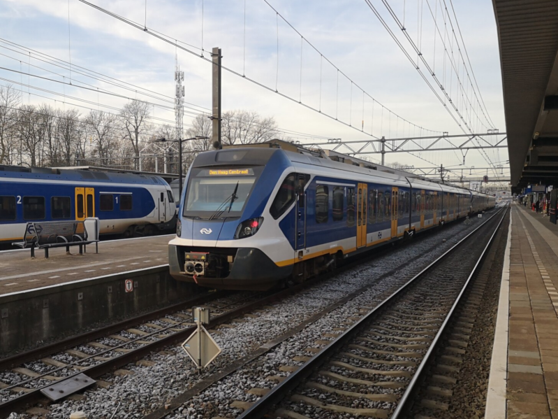 Treinstel 2760 achteraan elf bakken SNG die op 22 december 2021 klaar staan om een slag van Dordrecht naar Den Haag centraal te maken. Voorheen vertrok deze sprinter standaard van spoor 3a, maar sinds niet lang hiervoor de tienminutensprinter tussen Dordrecht en Rotterdam Centraal is ingevoerd, vertrekken sommige ritten nu ook van spoor 4a, zoals hier het geval is.