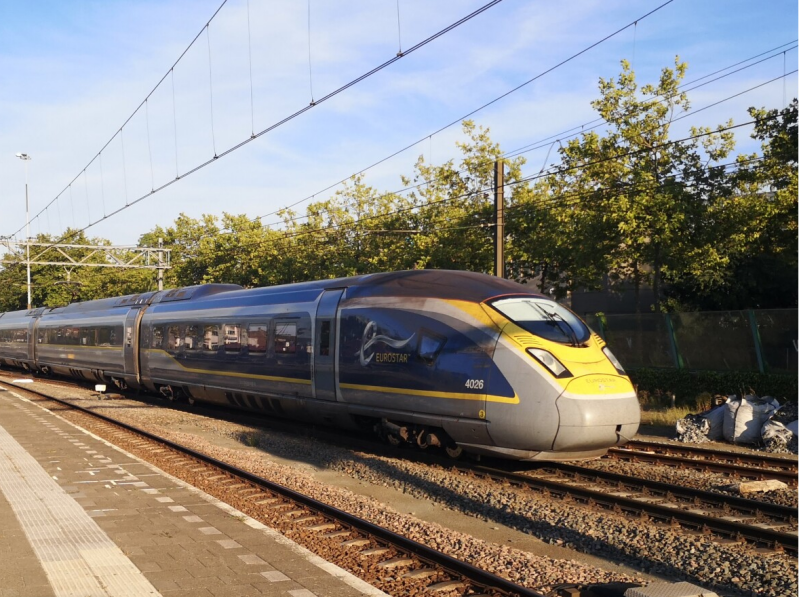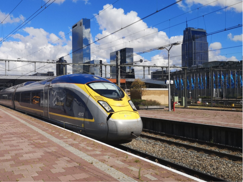 Eurostar e320-treinstel 4013 maakt op 3 juli 2022 een stop op station Rotterdam Centraal, om daarna door te rijden naar Amsterdam Centraal. Het treinstel heeft een aardige beschadiging aan de voorkant; naast een deuk in het grijze vlak is er ook een stuk beplating afgebroken.