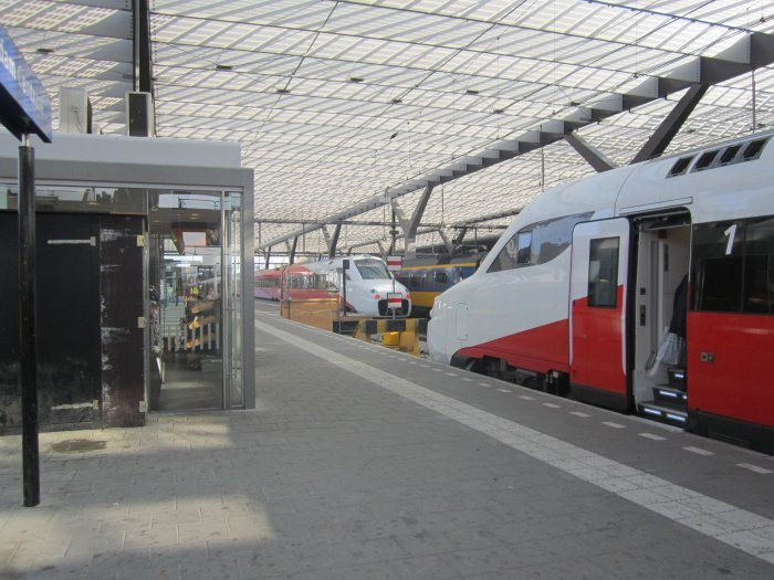 Een Fyra bestaande uit ICRm-rijtuigen op 28 mei 2011 langs perron 3 van het in verbouwing zijnde Rotterdam Centraal. Terwijl bijna overal al de nieuwe overkapping te zien was, heeft perron 1 nog heel lang de oude overkapping gehouden. Verder zien we nog het tijdelijke blauwe stationsgebouw en zelfs nog analoge CTA's.