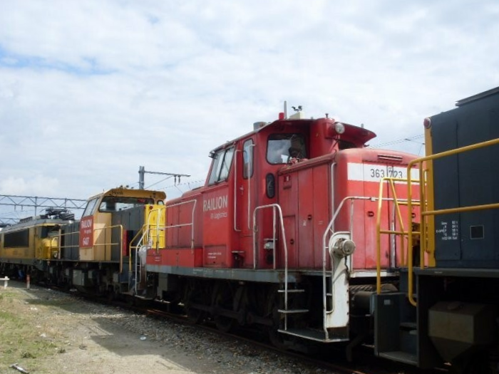 Loc 363 723 van Railion in de lange rij 1600'en en 6400'en op het emplacement bij de Waalhaven in Rotterdam, 7 juli 2011. De van oorsprong West-Duitse Baureihe 363 wordt ook wel V60 genoemd, maar moet niet verward worden met de Oost-Duitse V60, die vandaag de dag bekend staan als Baureihe 346.
