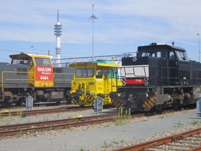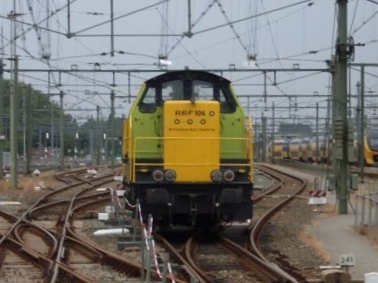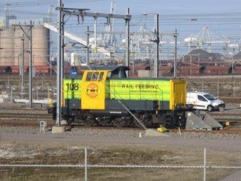 Na de buitendienststelling van de rangeerlocomotieven uit Reeks 73 van de NMBS in 2009 zijn er acht exemplaren naar goederenvervoerder Rotterdam Rail Feeding gegaan. Links zien we de 106 (ex-NMBS 7387) die werd gebruikt als rangeerkracht bij de verbouwing van Rotterdam Centraal, 28 mei 2011. Rechts staat de 108 (ex-NMBS 7380) op een kopspoor in Europoort.