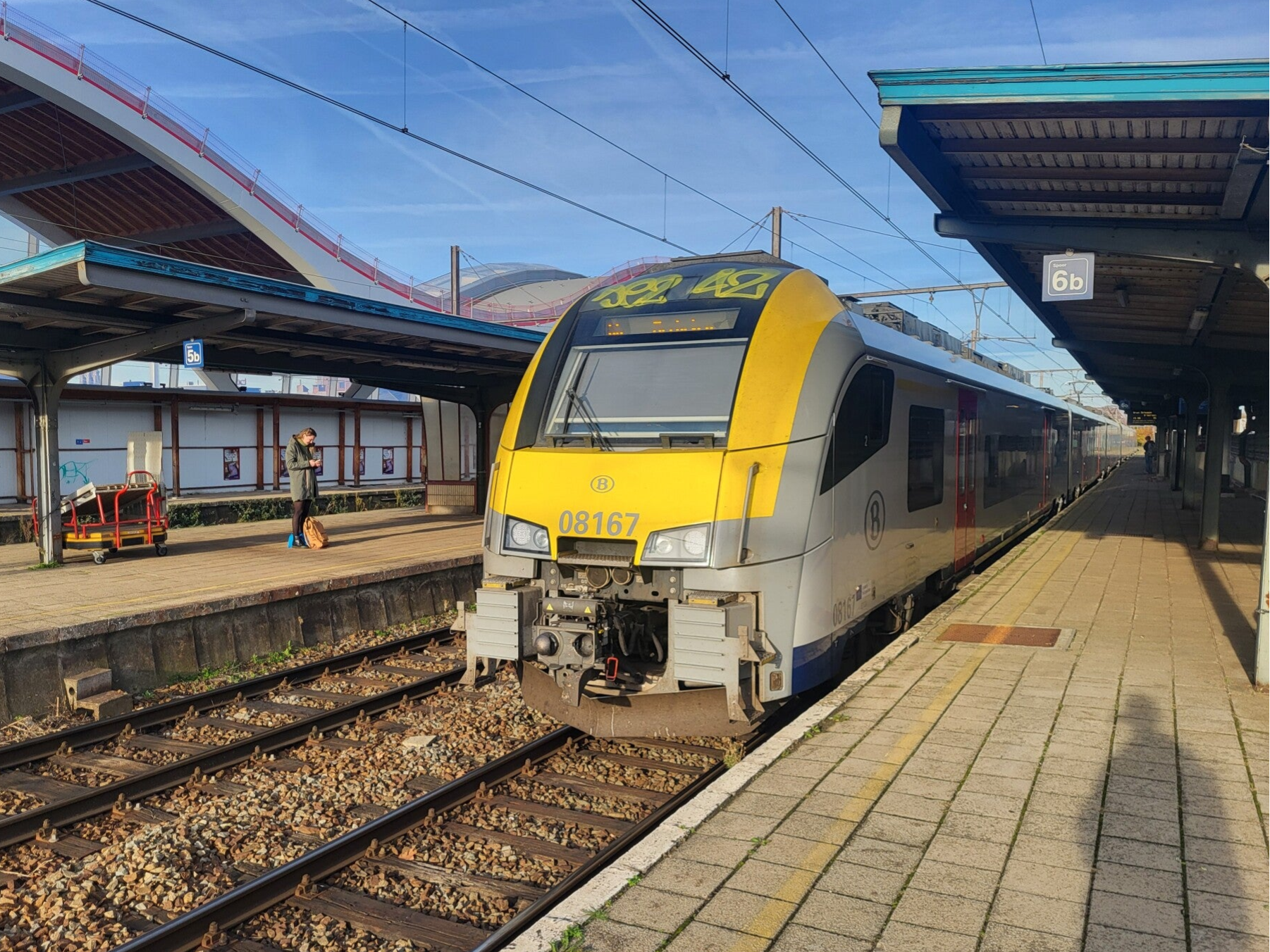 MS08 no. 08147 staat op spoor 2 te wachten op vertrek naar Zeebrugge-Dorp.