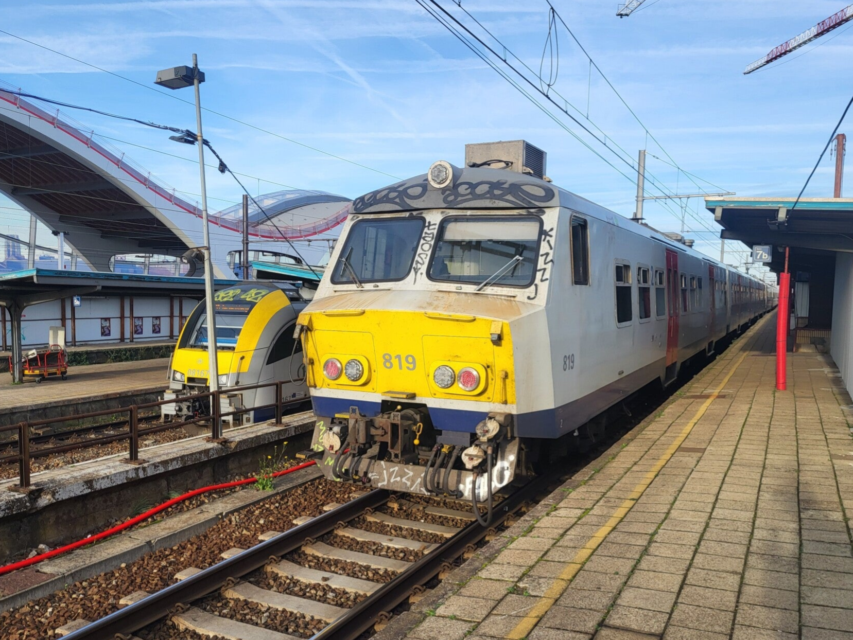 MS75 no. 819 komt samen met de 842 aan op het hoger gelegen spoor 7, onderweg van Binche naar Turnhout.