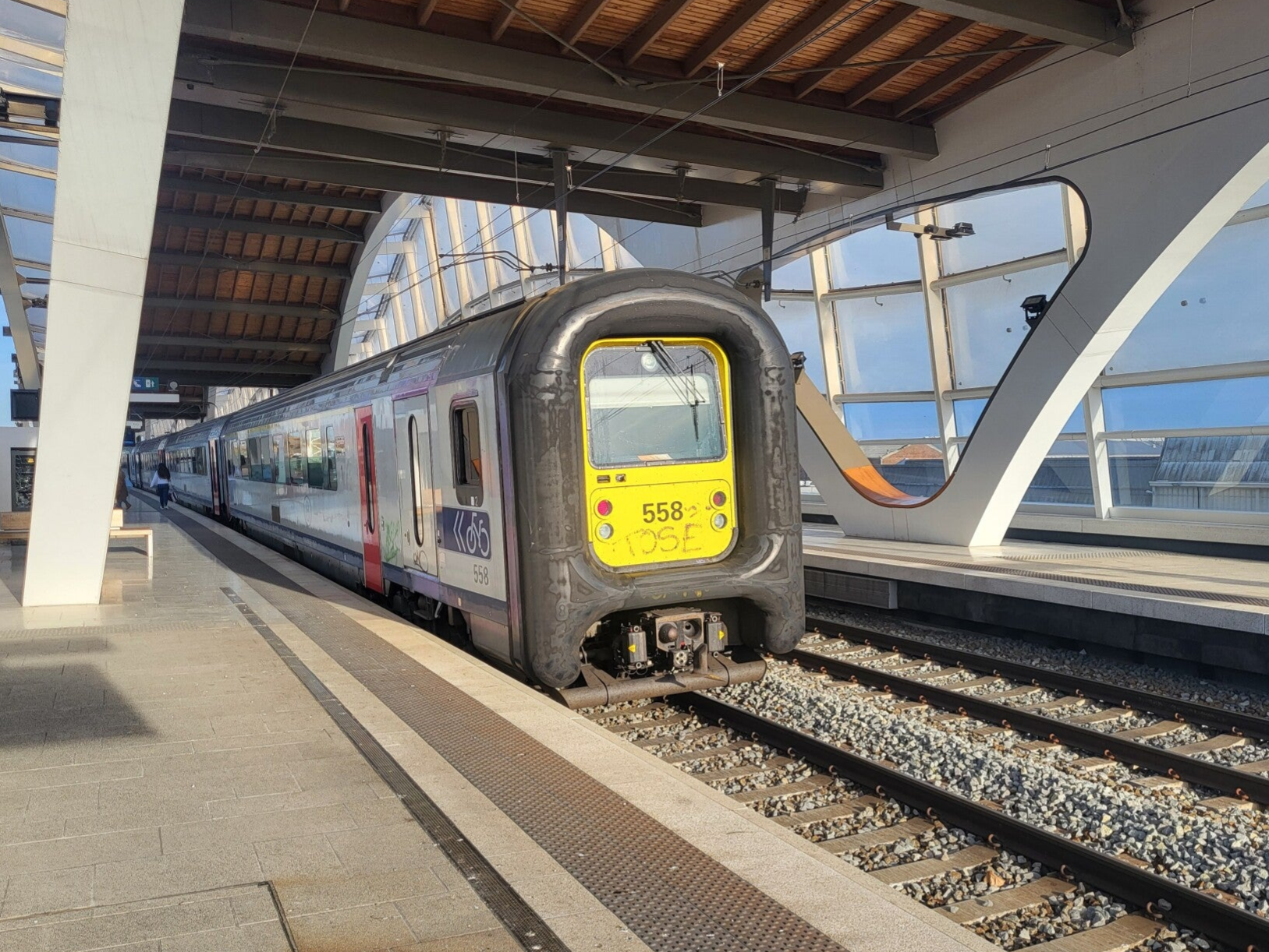 MS96-stel 558 rijdt voorop de intercity van Turnhout naar Binche en maakt daarbij een stop op spoor 11 van station Mechelen, 12 november 2025.