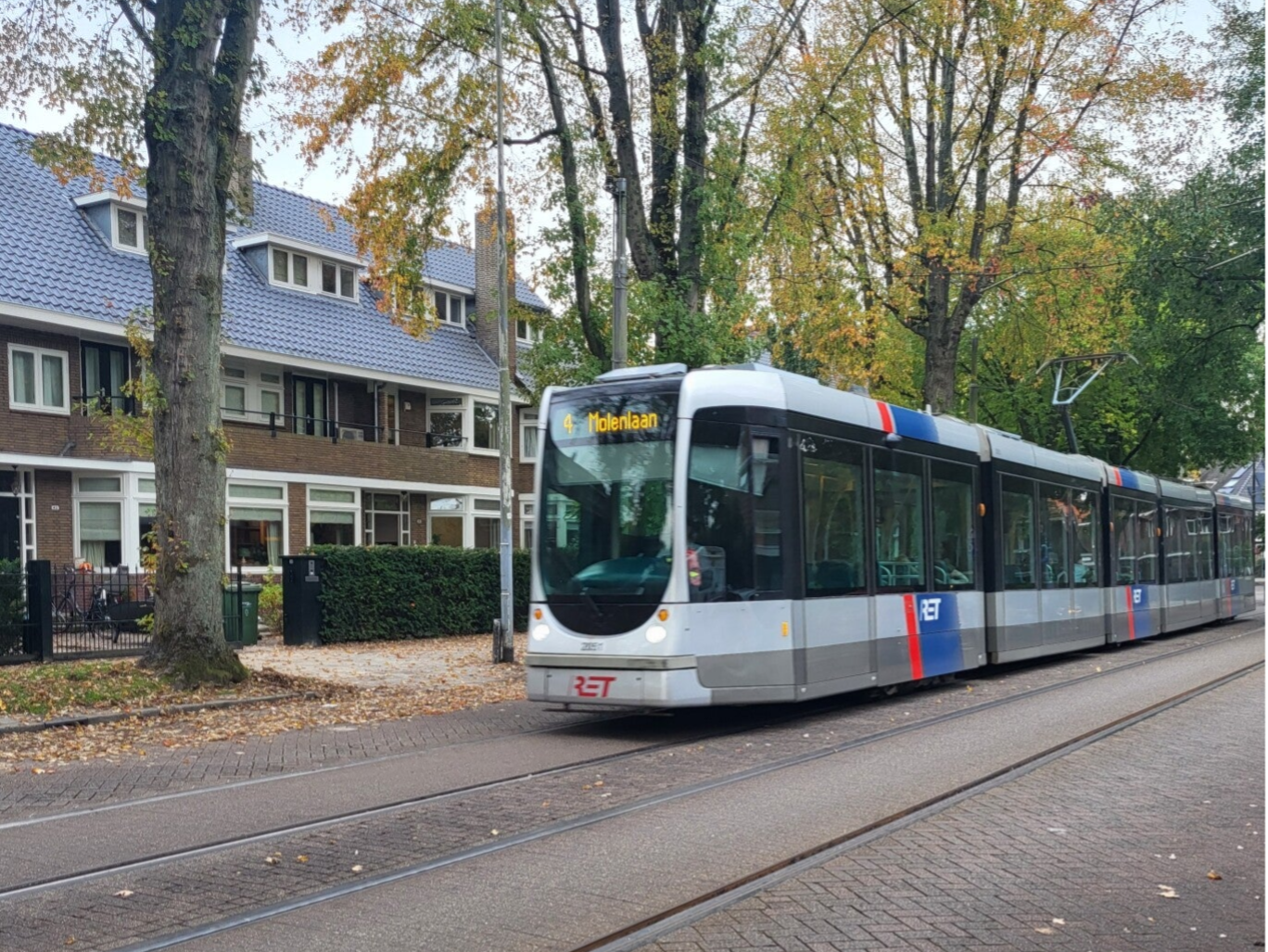 Citadis 2051 komt op 11 oktober 2025 door de groene Burgemeester Le Fèvre de Montignylaan in Hillegersberg, één halte voor de keerlus aan de Molenlaan.
