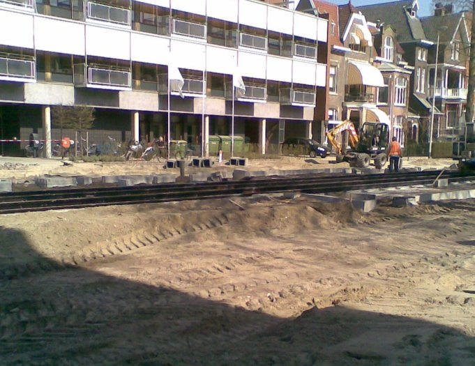 Werkzaamheden aan het tramspoor op de Oudedijk in Rotterdam op 28 maart 2012. Hierdoor is van januari tot november 2012 deze weg afgesloten. Normaal rijdt tramlijn 7 hier naar Woudestein, maar door deze werkzaamheden is de lijn verkort tot Oostplein. Aan de breedte van het bouwterrein hier te zien, krijgt de tram hier een vrije baan, maar dat is niet overal zo.