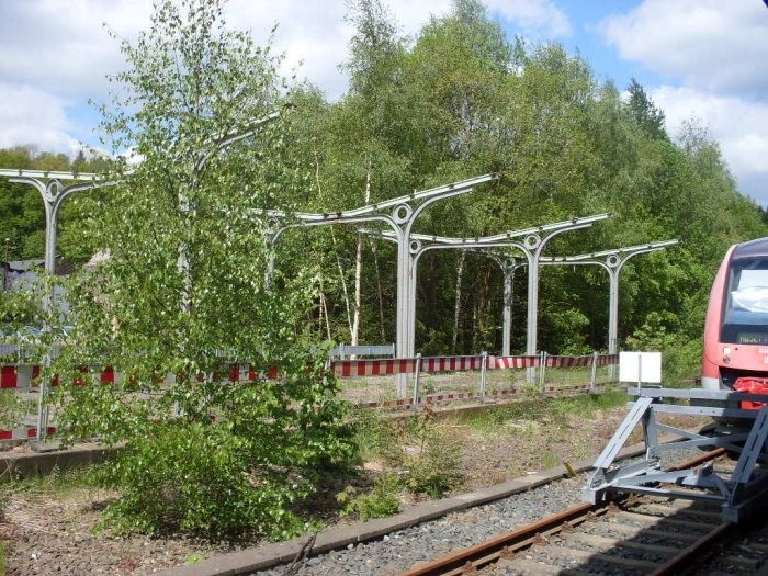 De twee verlaten perrons (nog inclusief de pilaren van spoorstaaf) van het Duitse station Olpe.
