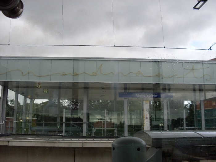 Het stationsgebouw van Rotterdam Noord, ontworpen door Sybold van Ravesteyn, is ondertussen afgesloten van de perrons. Hier zie je waar ooit de toegang naar het perron was. In het stationsgebouw staat ten tijden van deze foto (5 november 2011) een kunstexpositie, tegenwoordig is er een café.