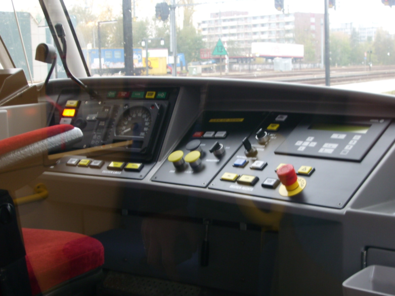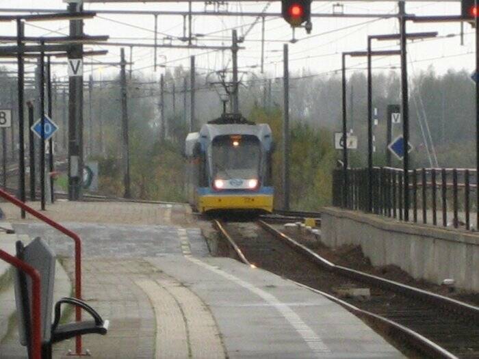 Twee A32-stellen komen op 3 november 2007 het station van Gouda binnenrijden. De A32-trams maakten standaard gebruik van spoor 9, één van de twee zaksporen die station Gouda rijk was. Vanwege de lage vloer van deze trams waren alle stations langs de lijn voorzien van lage perrons, wat ook bij spoor 9 in Gouda het geval was. Rechts een kijkje in de cabine van het achterste tramstel.