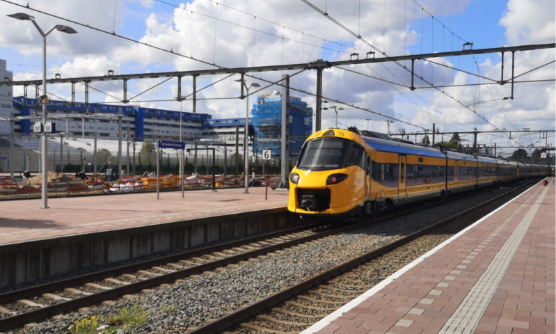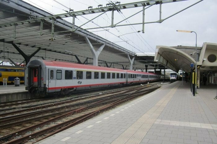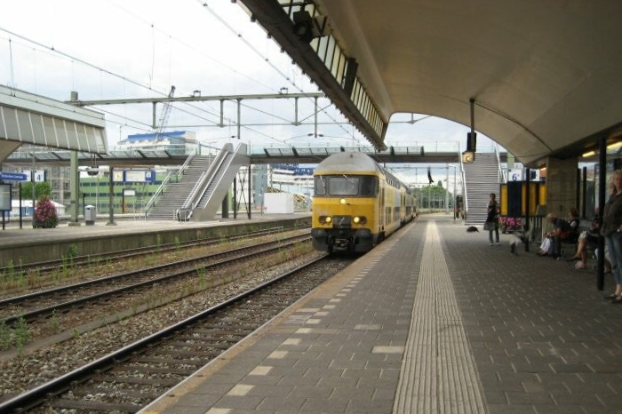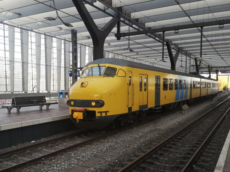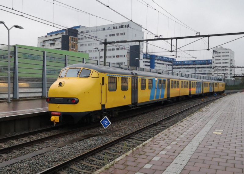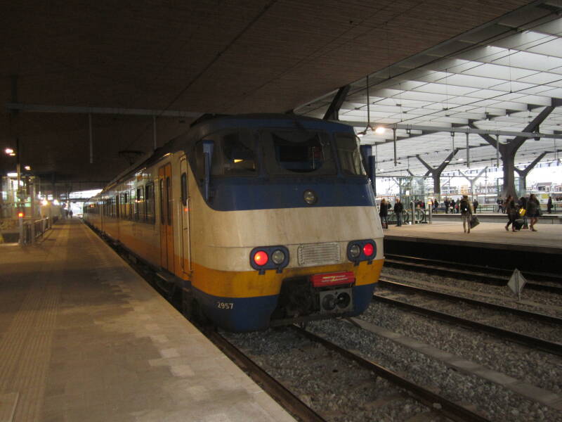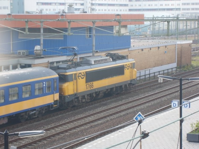 De intercity van Venlo naar Den Haag Centraal, bestaande uit loc 1766 met een ICK-stam, rijdt langs het uit 1957 stammende gebouwt op eilandperron 8/9. Dit is het enige bouwwerk van het originele station dat er vandaag de dag nog staat.