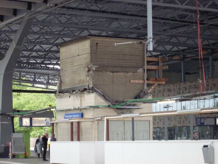 Tijdens de Dag van de Bouw op 28 mei 2011 was er een kijkje achter de schermen te nemen bij de verbouwing van Rotterdam Centraal. Vanaf de loopbrug was al goed het verschil tussen de oude overkapping aan de rechterkant en de nieuwe overkapping aan de linkerkant te zien. Tevens zien we het tijdelijke blauwe stationsgebouw.