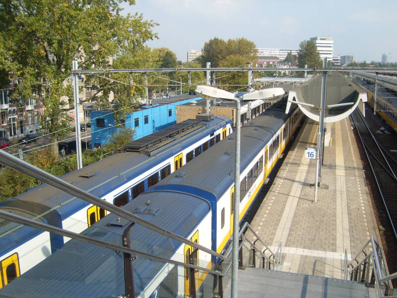 Het uitzicht vanaf de voetgangersbrug op onder andere SGMm 2970 langs perron 16, dat samen met perron 15 het smalste eilandperron van dit station vormt. Links achter de bomen zien we de historische bebouwing langs de Stationssingel in de wijk Blijdorp.