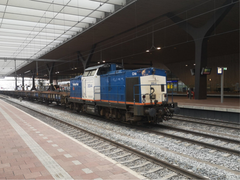 Op 5 februari 2023 staat de 203-4 van VolkerRail met een ballasttrein op spoor 5.