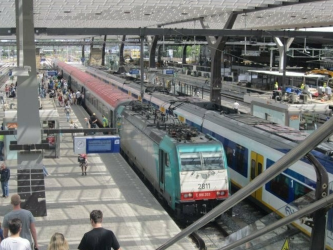 Op 18 mei 2012 maakt een uit Oostenrijkse rijtuigen bestaande Beneluxtrein een stop op spoor 3.