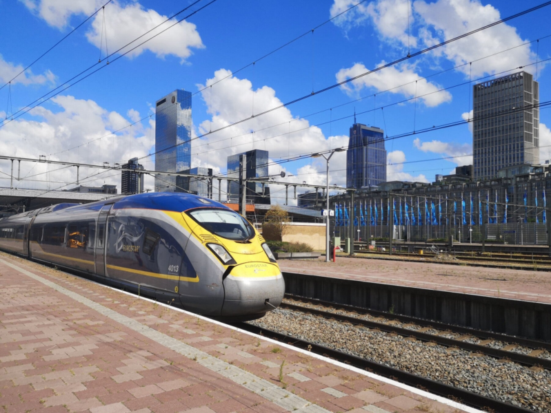 Eurostar e320-treinstel 4013 maakt op 3 juli 2022 een stop op station Rotterdam Centraal, om daarna door te rijden naar Amsterdam Centraal. Het treinstel heeft een aardige beschadiging aan de voorkant; naast een deuk in het grijze vlak is er ook een stuk beplating afgebroken.