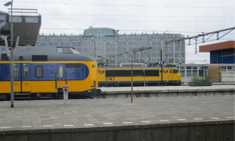 ICMm 4234 en loc 1747 met in de achtergrond het Groothandelsgebouw, een mooi voorbeeld van de wederopbouwarchitectuur na de Tweede Wereldoorlog.