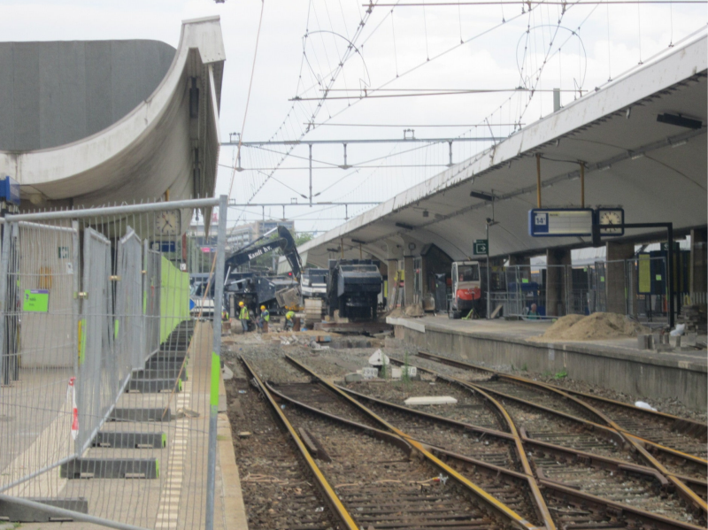 Hier zien we het verschil tussen de overkappingen wat beter, tevens zien we de werkzaamheden aan de sporen 14 en 15.