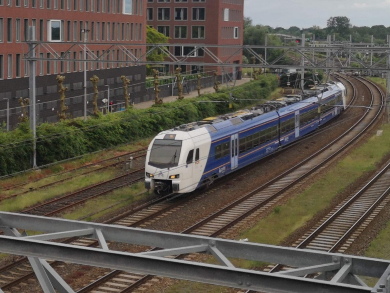 Met tien dagen ertussen zien we twee treinen de Paleisbrug passeren. Links komt loc 6423 voorbij met een korte ballasttrein op 20 mei 2024, rechts komt een van de FLIRT-stellen voor de Drielandentrein van Arriva langs op 30 mei 2024.