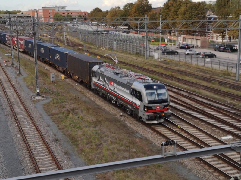 De 193 542 van het Zwitserse SBB Cargo International komt op 28 september 2024 met een containertrein langs de Paleisbrug.