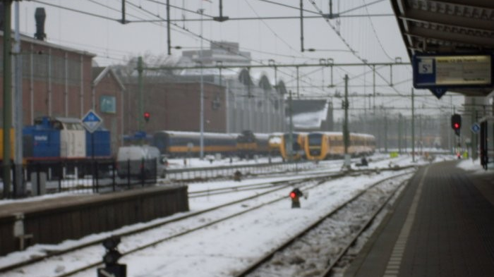 Een verscheidenheid van materieel op de opstelsporen naast de werkplaats, vastgelegd op 23 december 2009. Van links naar rechts zien we een V100, een rij ICRm-rijtuigen, een 1700, een Plan U en twee rijen Buffels. Het voorste treinstel heeft een gele streep op de neus, dit is een sticker die was aangebracht op de vier treinstellen (3401 en 3443 - 3445) die onder de vlag van dochteronderneming RegioNS de exploitatie op de lijn Apeldoorn - Zutphen verzorgden.