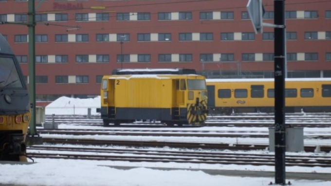 Een rangeerrobot op het terrein van de werkplaats in Zwolle, 23 december 2009. Deze radiografisch bestuurbare locjes hebben een opklapbare koppeling waardoor ze zowel met ouderwetse schroefkoppelingen als automatische Scharfenbergkoppelingen kunnen omgaan.